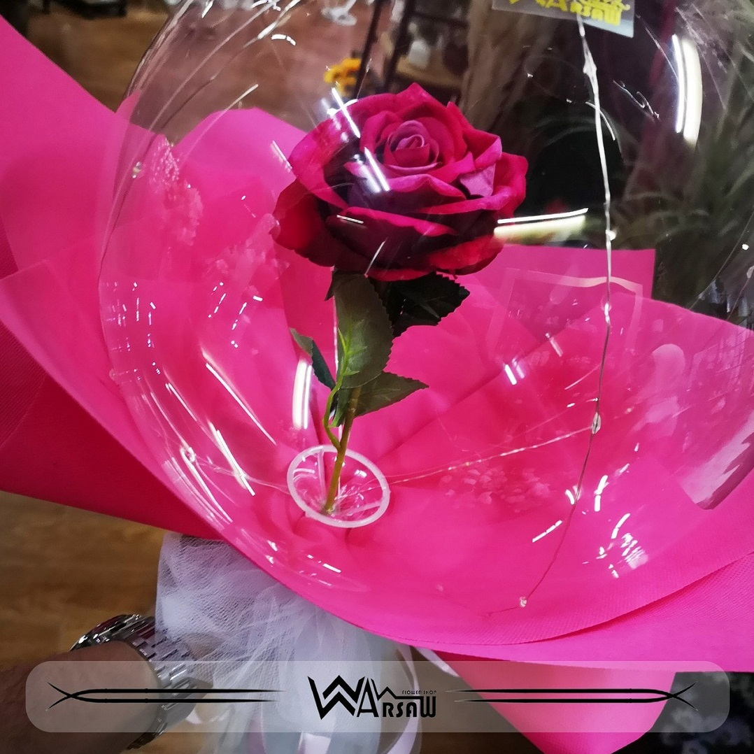 باقه مكونه من بالون شفاف بداخله وردة باللون الذي تختاره مغلفه بتغليف ملون لتجعل هديتك ذكرى مميزة.