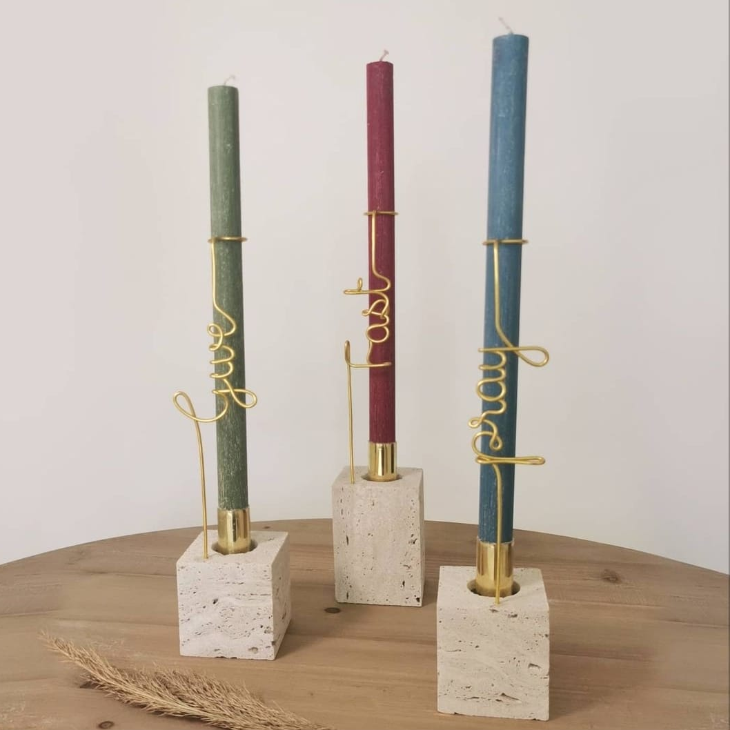 With wired name, travertine marble base, candle and brass tube.. - Base : 6x6x8 cm, height 45cm For: 154000 sp..