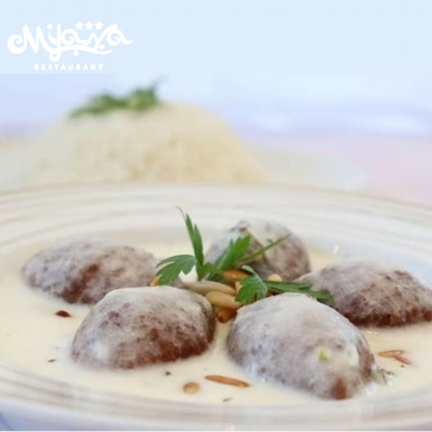 عجينة الكبة: برغل ناعم منقوع، دقيق ، وملح وفلفل. مكونات الحشوة: لحم طازج مفروم ناعم وبصل وتوابل وملح إضافة للمكسرات. تقلى الكبة وتغمس باللبن المطبوخ.