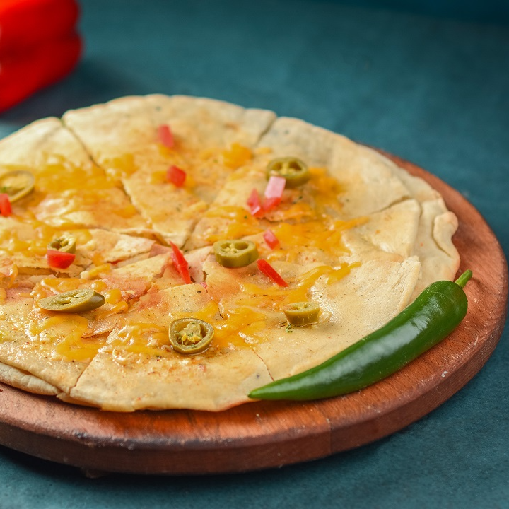 كاساديا لحمة .. المكونات : عجينة شهية محشية شرائح لحم طازج وبصل وفليفلة خضراء طازجة و دبس بندورة و زبدة و بهارات مشكلة .. وتزين بحلقات الزيتون الأخضر والفلفل الأحمر