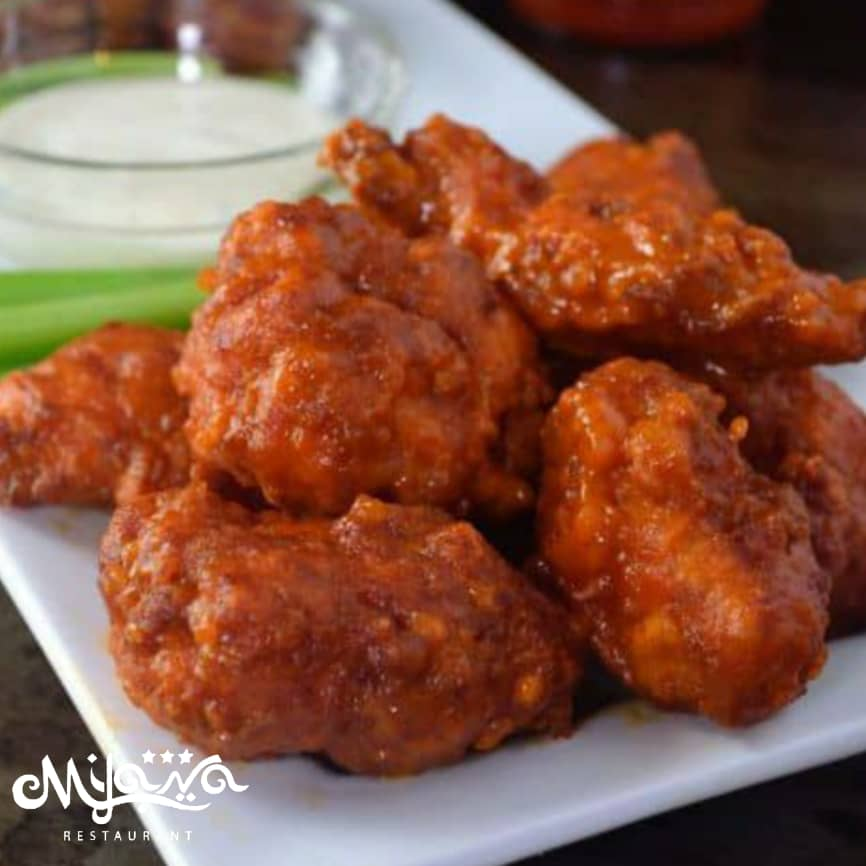 المكونات: أجنحة دجاج طازج، وبهارات (بيكنغ باودر- فلفل أسود- بودرة بصل- بودرة ثوم- بابريكا- ملح). وصوص البوفالو المكون من (زبدة- كاتشب- شطة حارة- عسل- فلفل- اوريغانو)